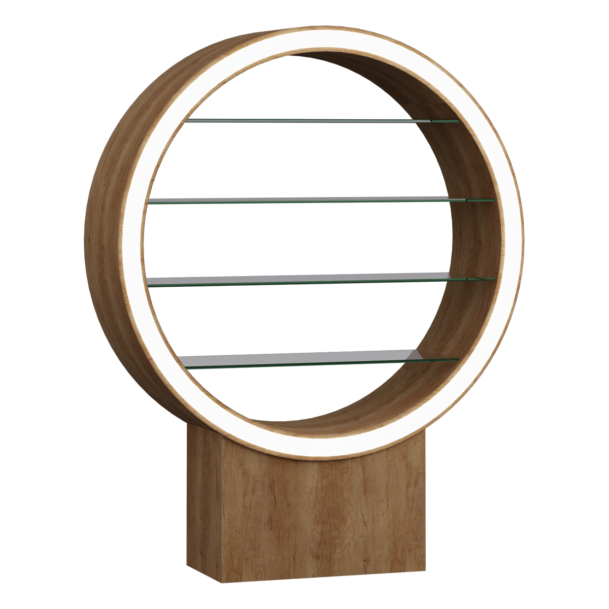 Η Ραφιέρα Περσεφόνη ξεχωρίζει για τον μοντέρνο κυκλικό σχεδιασμό της, που συνδυάζει την αντοχή της ξύλινης κατασκευής με την κομψότητα του plexiglass. Με κρυφό LED φωτισμό και 4 ανθεκτικά κρυστάλλινα ράφια, προσφέρει ιδανική προβολή των προϊόντων σας, ενώ η στιβαρή βάση 20 cm εξασφαλίζει σταθερότητα και ασφάλεια.